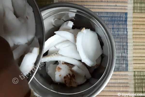 Keep a few small pieces aside and grind the remaining coconut flesh in a mixer jar, adding the tender coconut water.