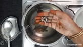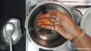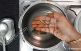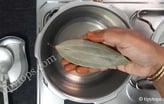 Once the oil is heated, add one bay leaf (tej patha), one inch cinnamon (dalchini)