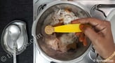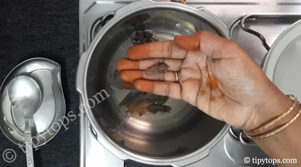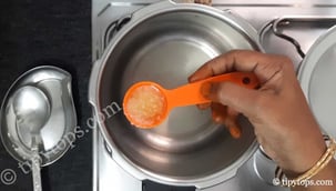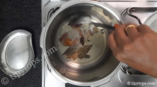 In a pressure pan/cooker, add two tbsp of oil, two tbsp of ghee (clarified butter), one tbsp of coconut oil