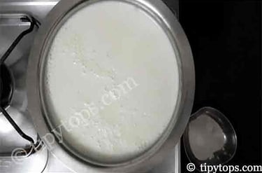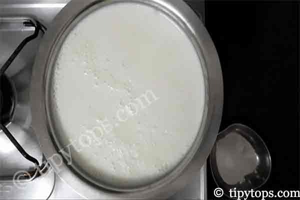 Once the milk comes to a boil, switch off the stove. Cover the vessel with the lid slightly open and let it rest for 30 minutes. This resting period helps the cream (malai) to form on the surface.