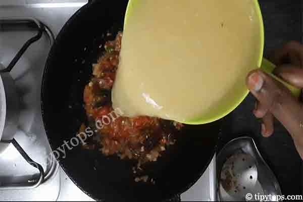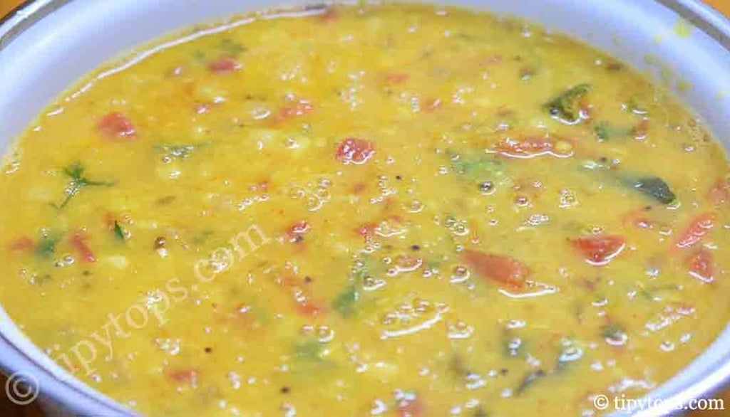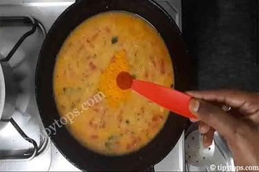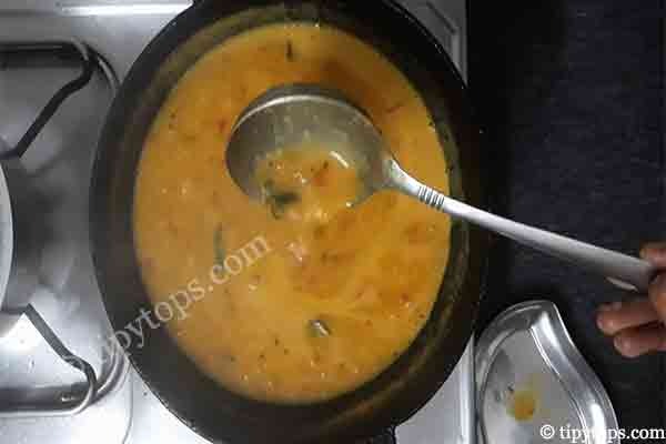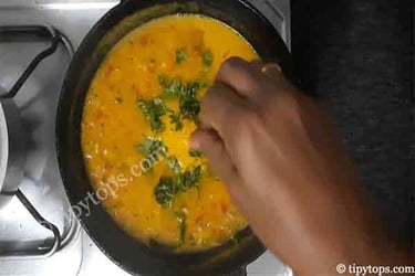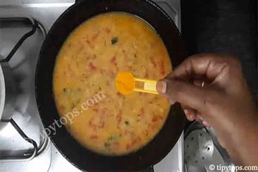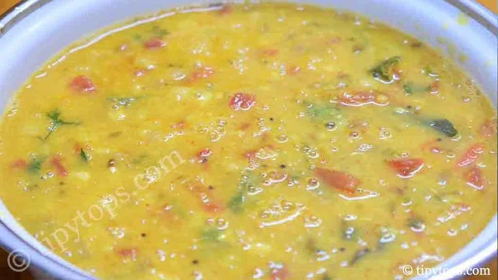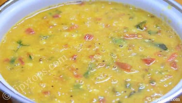 Now add the boiled toor dal along with one glass of water, mix well, and cook for 5β10 minutes.