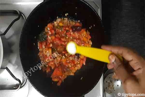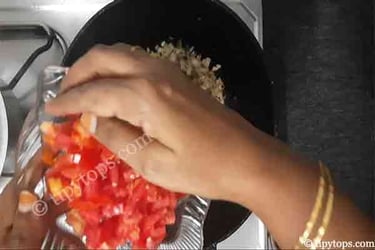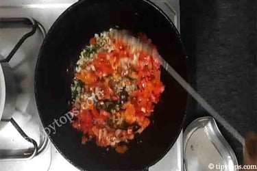 Once the onion becomes soft, add two chopped tomatoes.