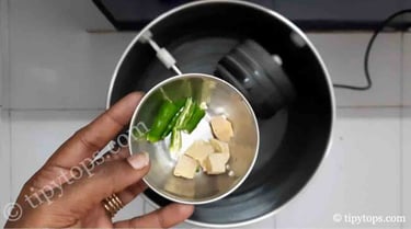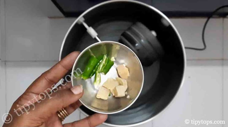Add 2 green chillies and 1 inch ginger and grind into a fine paste.