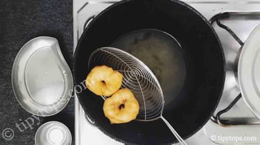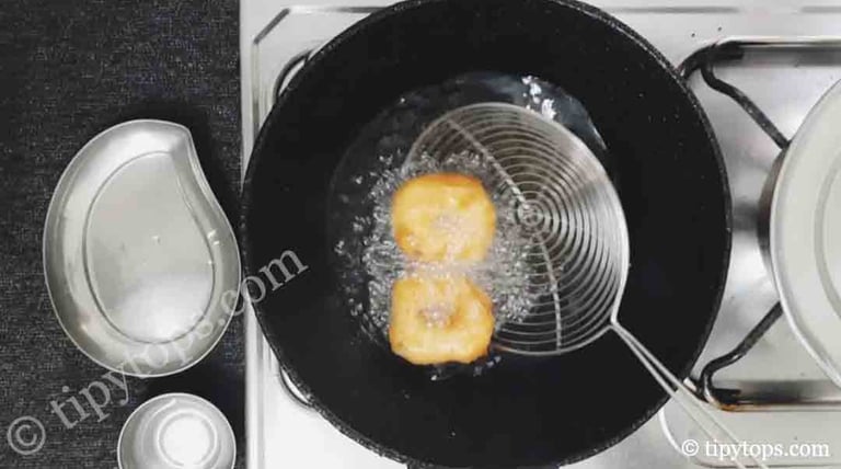 Take a small amount of batter, shape it with a hole in the centre, and gently drop it into the oil.