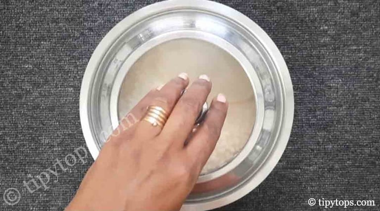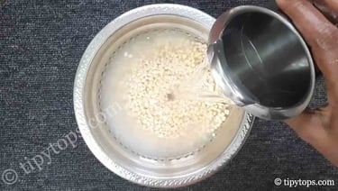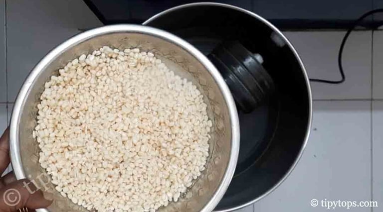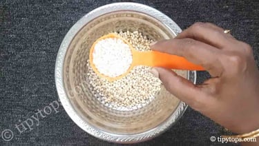 In a bowl, add 250 g urad dal and β cup (30 ml) raw rice.
