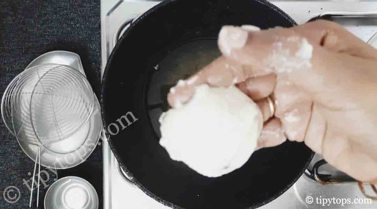 Take a small portion of batter using four fingers, gently pat it with your thumb.