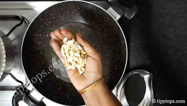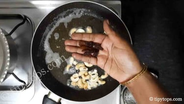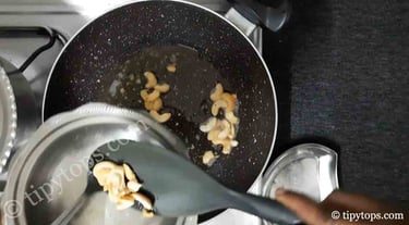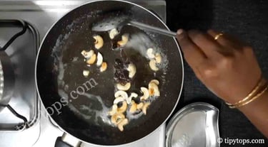 Add 1 handful (30 g) cashew nuts and 1 tbsp dry grapes, roast until golden, and remove to a bowl.