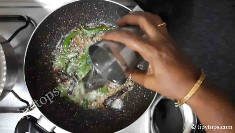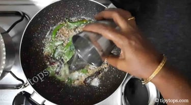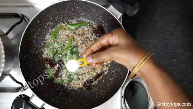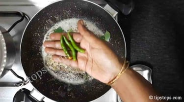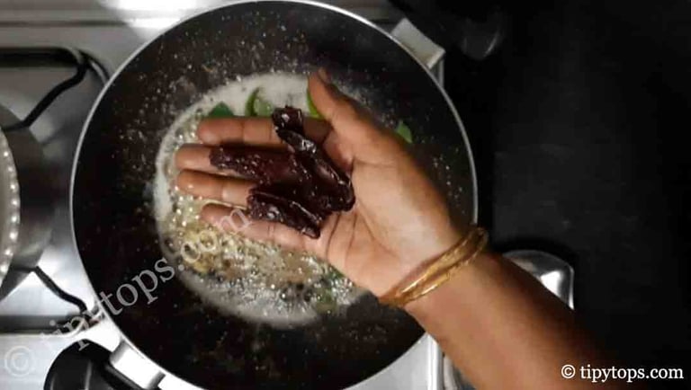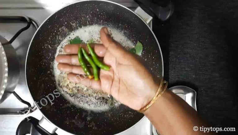 Add 1 tbsp chopped ginger, 2 bunches curry leaves, 3β5 slit green chillies, and 3β5 red chillies.