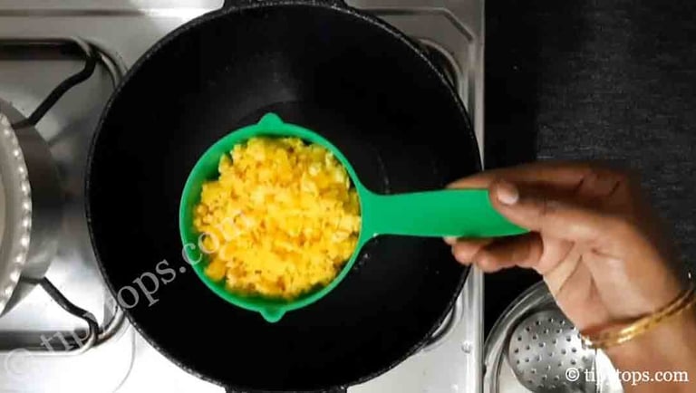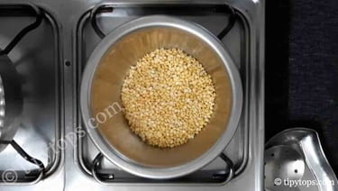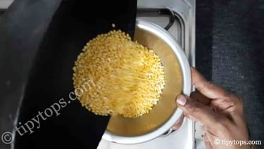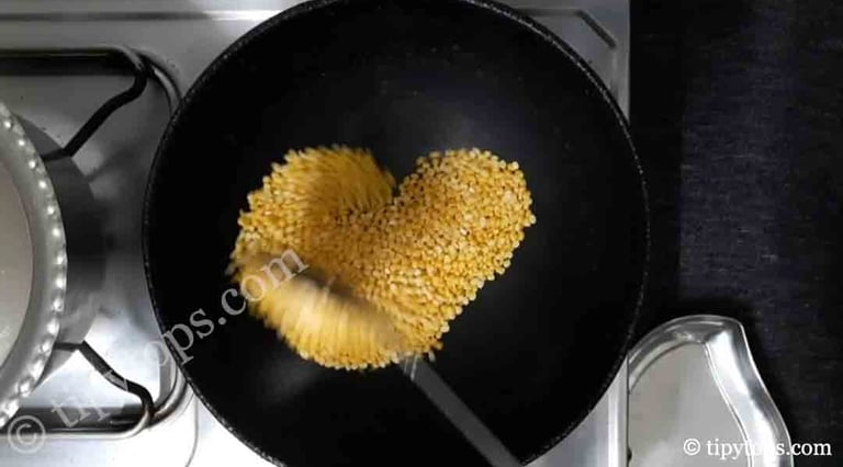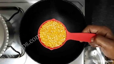 In a kadai, add Β½ cup (125 g) yellow moong dal.
