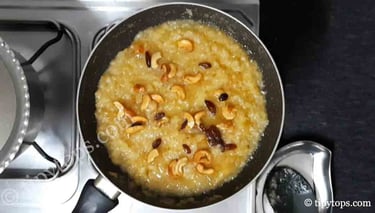 Once the Pongal reaches perfect consistency, add the roasted cashews and dry grapes.